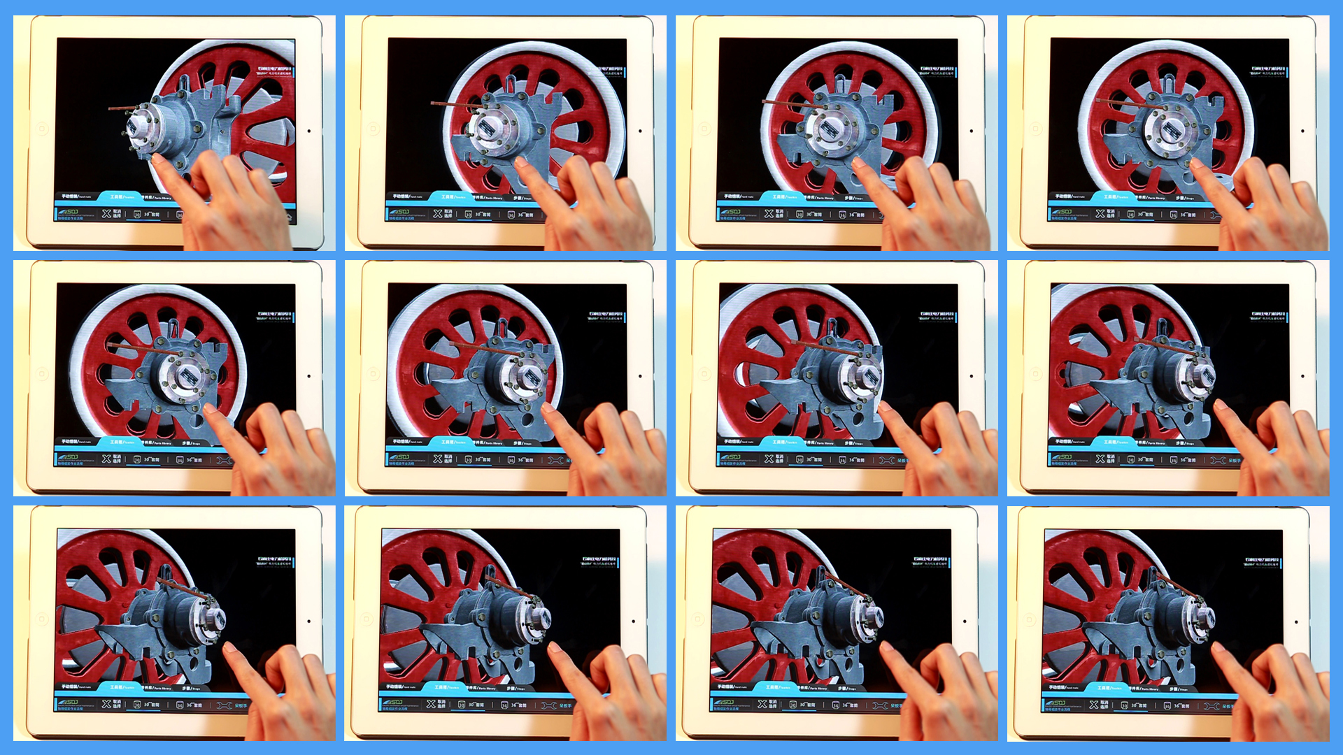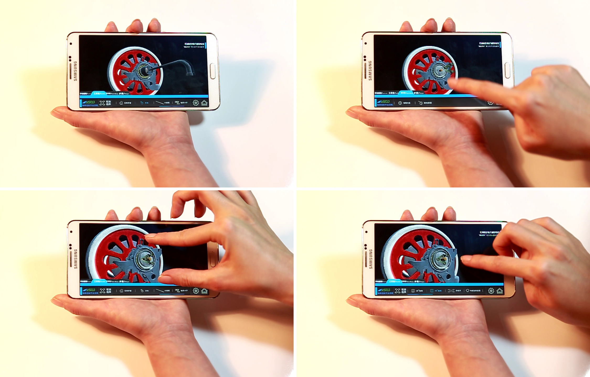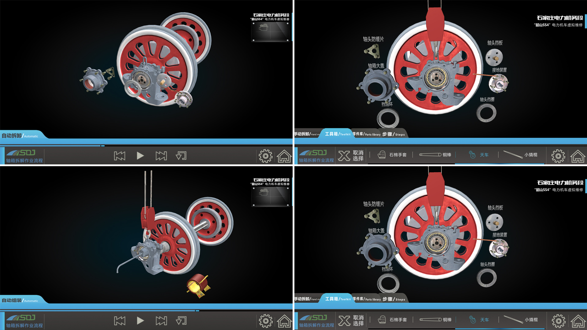 该系统分为自动拆解、手动拆解、自动组装、手动组装四种模式。方便使用者的各阶段使用需求。四种模式均可实时在三维环境下360度全方位无死角观察浏览,快速方便的使用户了解结构特点与操作细节。其中自动模式下可随意控制开始、暂停、回放、快进、快退等功能,并在播放过程中根据需求任意操作画面角度与缩放比例;手动模式下,可根据程序步骤,选择不同的工具与零件分步骤组装与拆卸,交互步骤细致到每一颗螺栓。